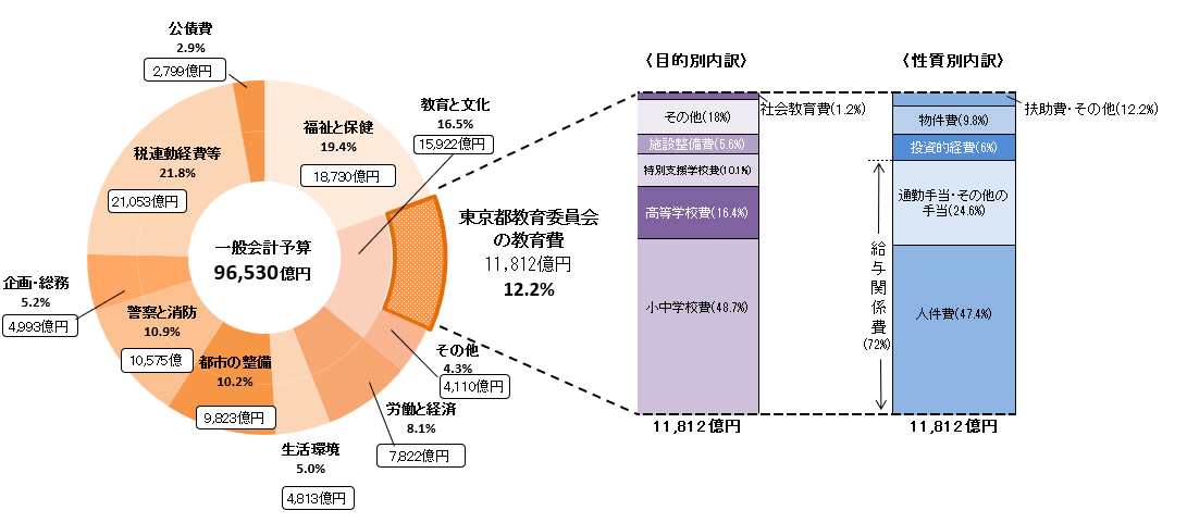 令和8年度の東京都教育委員会の予算額は1兆1,812億円で、東京都の一般会計予算9兆6,530億円の約12.2パーセントを占めています。