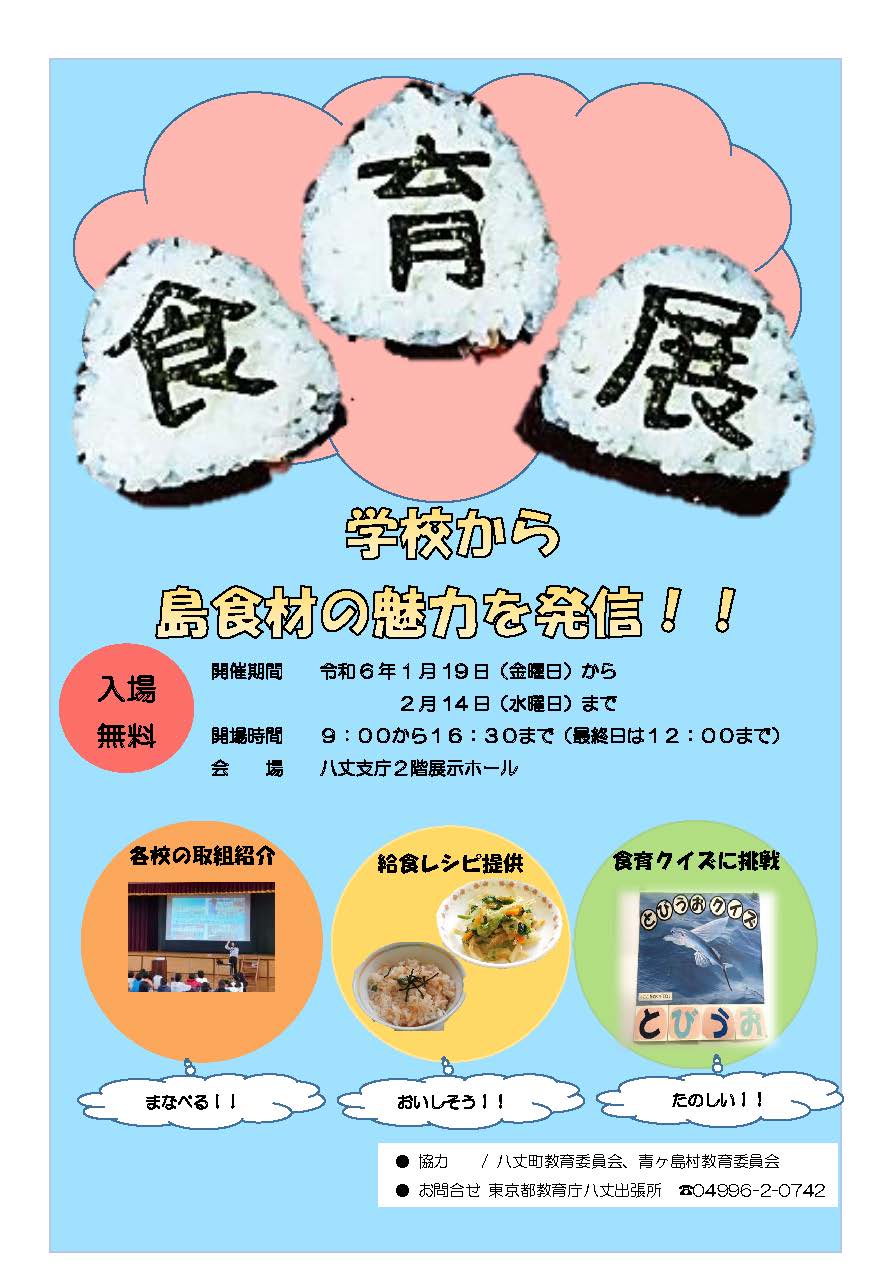 八丈支庁展示ホールにて、学校給食や食育に関する展示を行います。地場産物を活用した学校給食の紹介や、各校の食育の取組をご紹介しています。ぜひご家族でご来場ください。なお、ご来場の際は感染症予防対策へのご協力をお願いいたします。