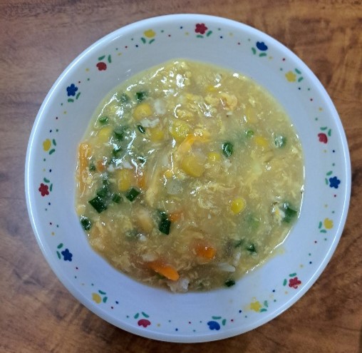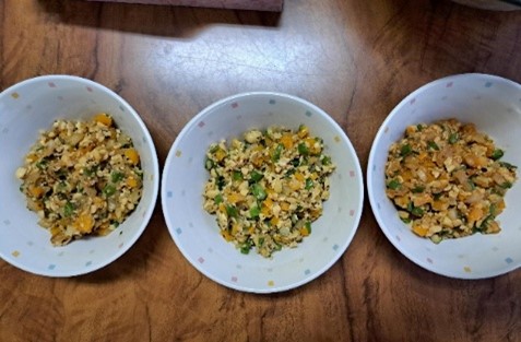 中国の料理で、コーンや卵を使用した料理です。片栗粉でとろみをつけて仕上げます。優しい味付けで食べやすい印象を受けました。試作では冷めると少しとろみが強く感じため、児童・生徒の喫食時間を考え、本番では片栗粉の量を減らすことが検討されました。