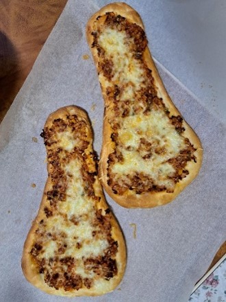 野菜や肉を炒めてトマトソースを作り、ナンの上にのせてチーズをかけて焼きました。試食した栄養士・調理員からは、児童・生徒も好みそうな料理であると意見がありました。具材が落ちないような配膳方法が検討されました。