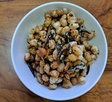 小魚と大豆を揚げて甘辛いたれを絡ませた料理です。小魚は普段不足しがちな食材であるため、給食で積極的に使用したいと考え、試作を行いました。家庭でも食べ慣れていない児童・生徒が苦手意識をもたないよう、たれの量や食材の量を検討しました。