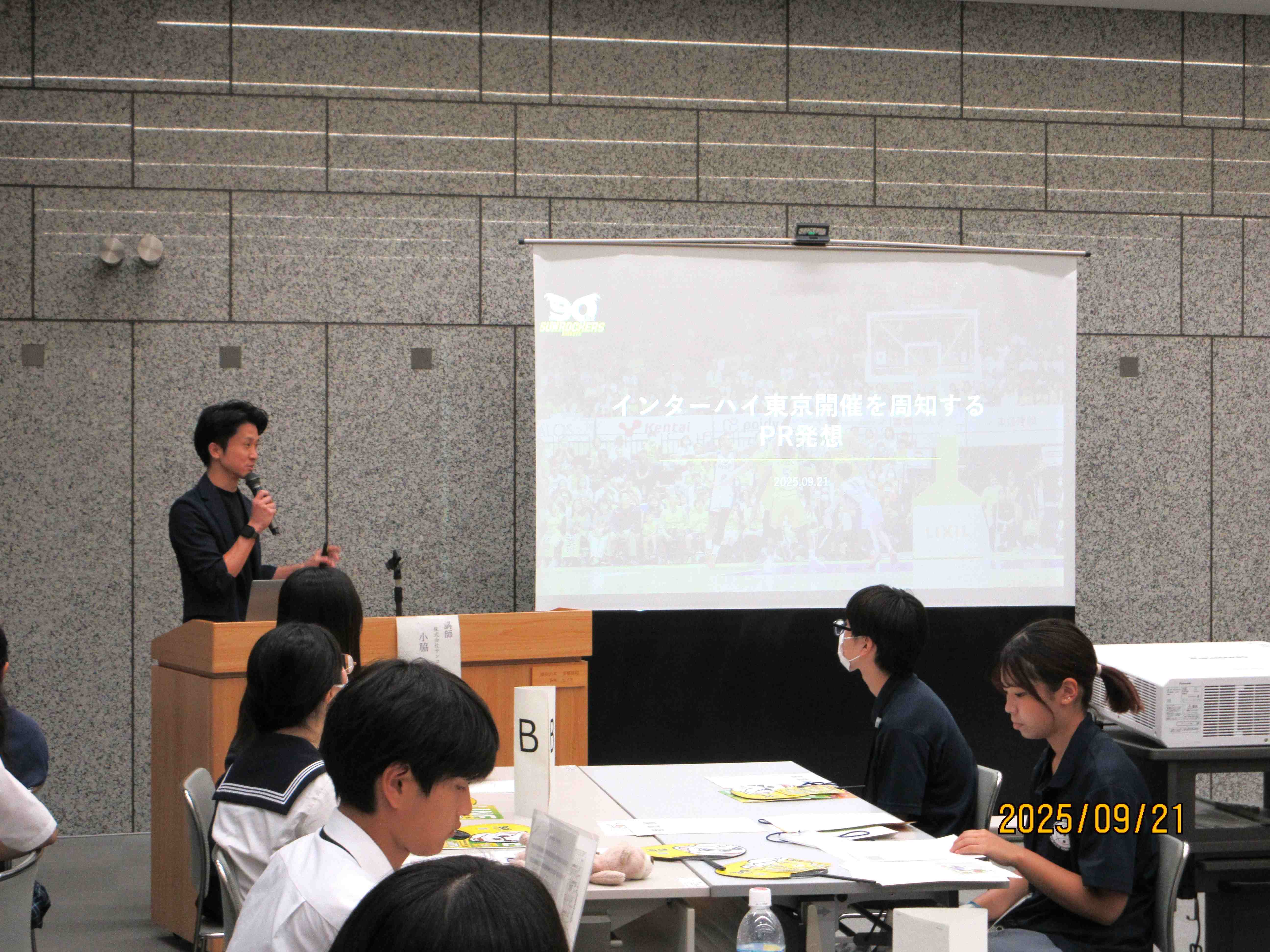 当日は、プロバスケットボールの広報活動について、集客やプロモーションの方法についての講話を聞いた後、「インターハイが東京で開催されることを周知するための広報活動」というテーマで意見交換を行いました。お互いの意見や考えを聞いて、新たな発見があったり、広報について理解を広げたりすることができました。