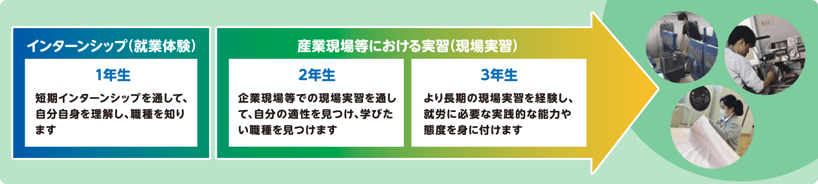 就業技術科・職能開発科では、3年間を通して実際の会社において働く経験を繰り返し行い、企業就労に必要な能力を育みます。