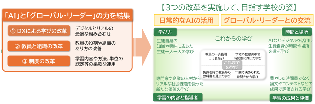 「次世代の学びの基盤プロジェクト」は、「AI」と「グローバル・リーダー」の力を結集して、「DX」「教員と組織」「制度」の3つの観点から改革を進めています。