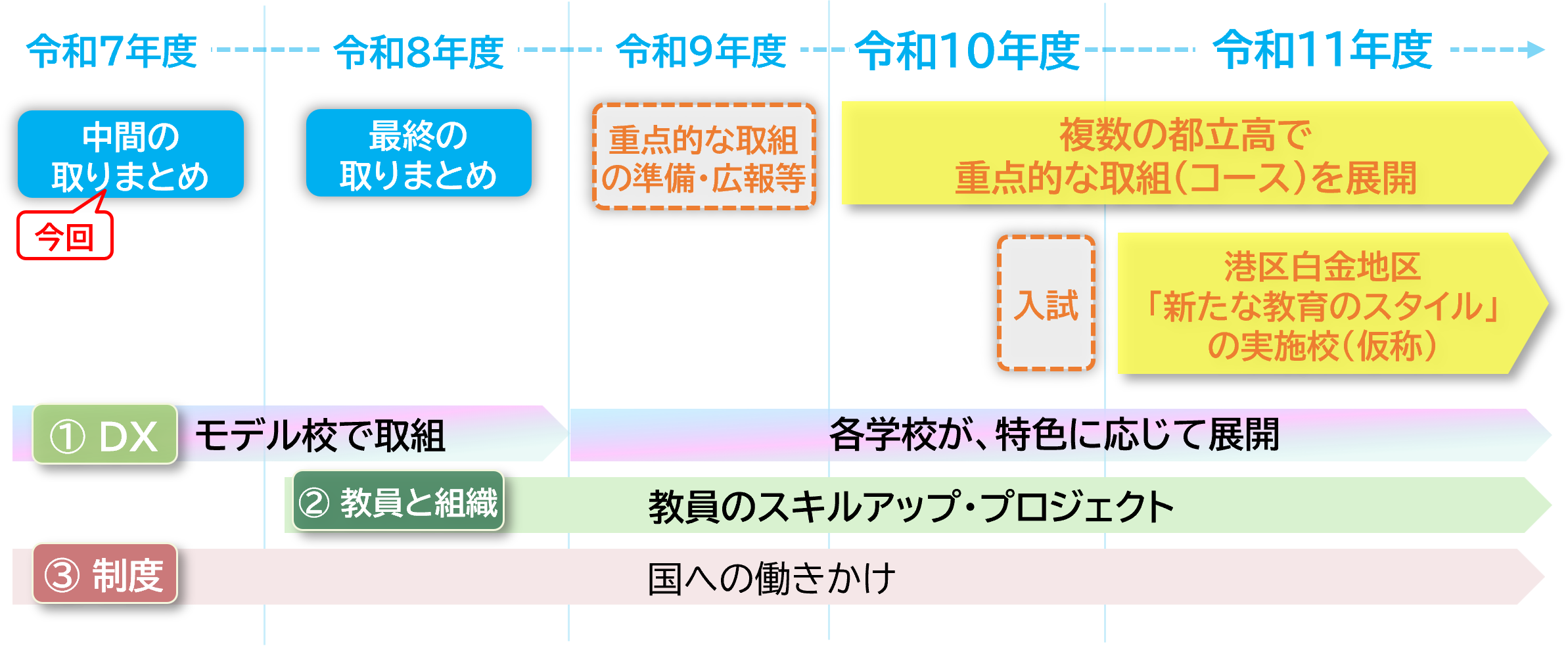 3つの改革を進めながら、令和8年度に「最終の取りまとめ」を行うとともに、各学校が「新たな教育のスタイル」を特色に応じて展開していきます。令和10年度には複数の学校で「新たな教育のスタイル」の重点的な取組を展開、令和11年度には港区白金地区に「新たな教育のスタイル」の実施校(仮称)を開校します。
