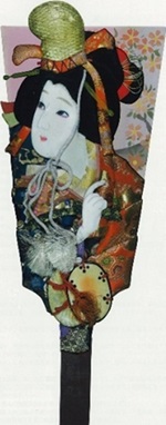 押絵とは台紙に布をかぶせて綿をくるみ立体的にしたもので、それを羽子板に取り付けたものが押絵羽子板である。文化文政期(1804~30)には既に存在していた。その製作は、下絵を描く「面相師」、下絵から形を起こし押絵を作る「押絵師」、着物の模様や紋を描く「上絵師」、小道具や背景を描く「小道具絵師」、型紙から羽子板を作る「木地師」、板の裏に絵を描く「裏絵師」が分業で行ない、問屋が組み立てて人形店で販売する。