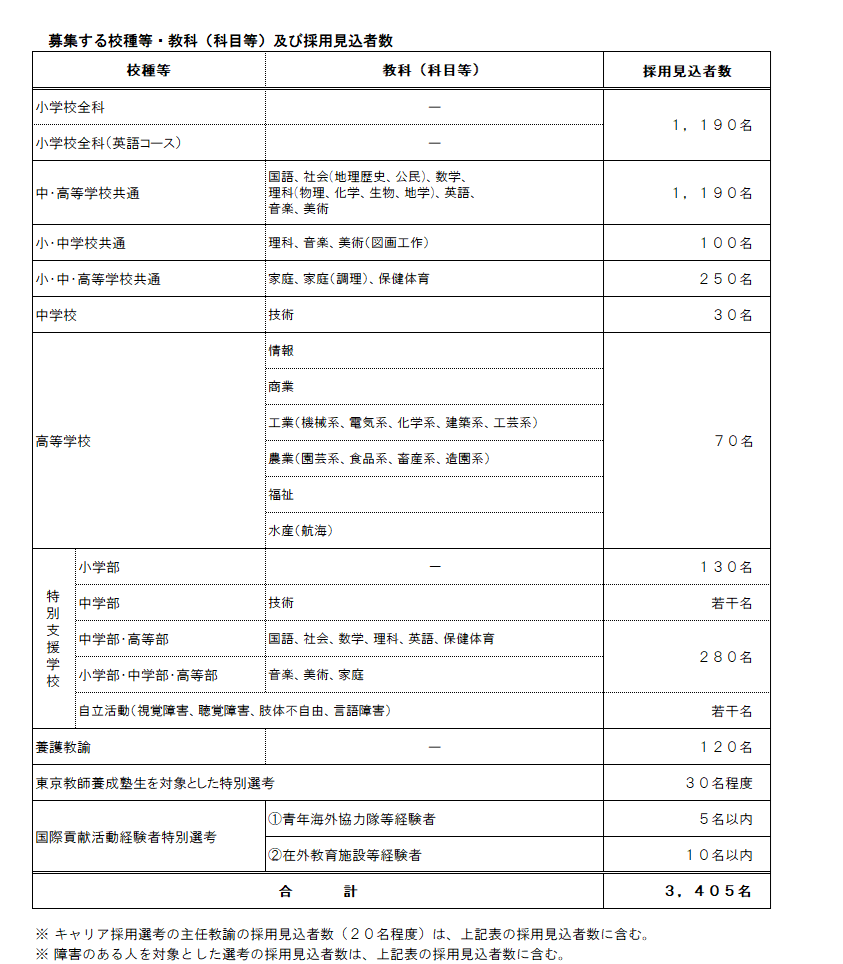 募集する校種等・教科(科目等)及び採用見込者数の詳細は、下記表のとおりです。
