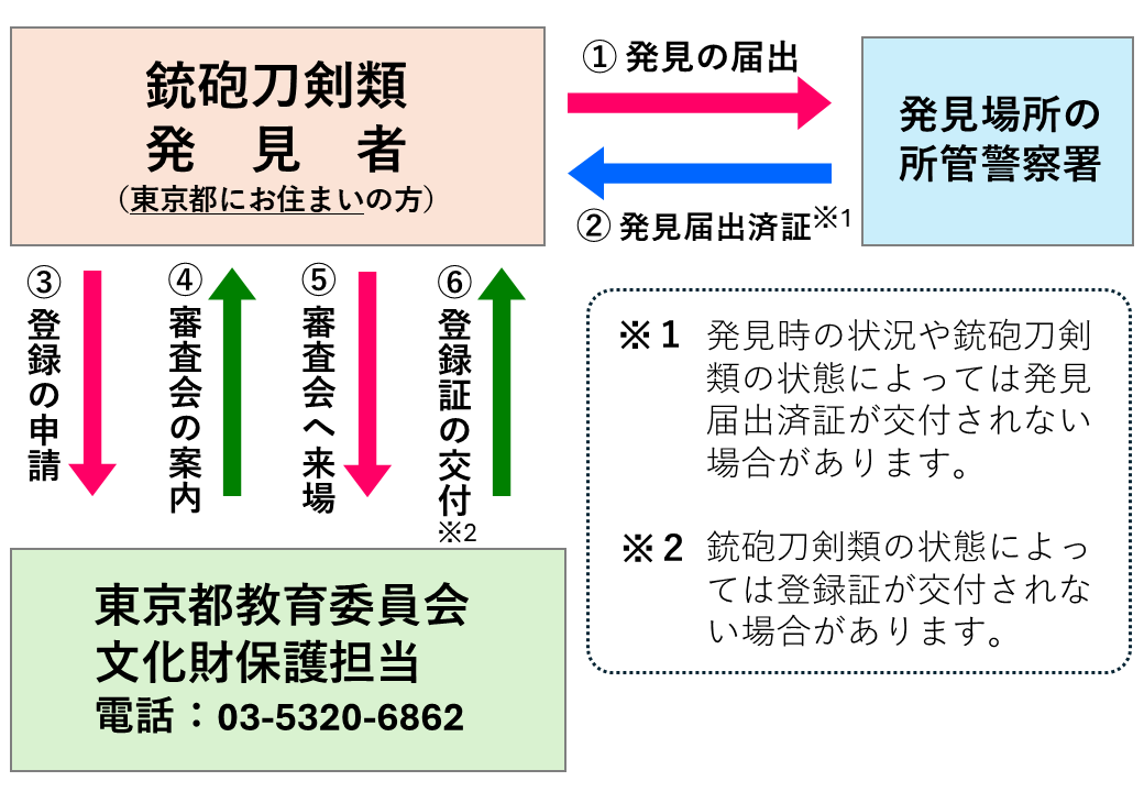 - 登録審査委員により鑑定を受け、登録基準を満たす銃砲刀剣類であると判断されれば登録原票・登録証を作成し、東京都教育委員会が登録証を交付します。