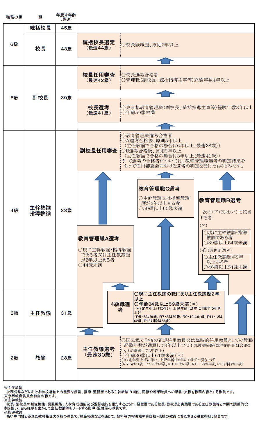 • 下記の年齢(年度末年齢)は、教育管理職A選考に合格し、最短で昇任した場合の例です。